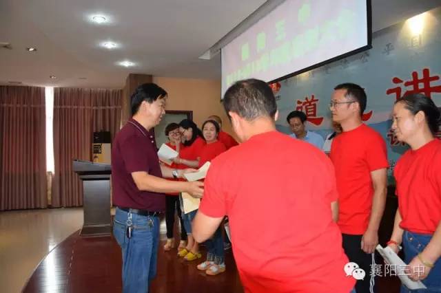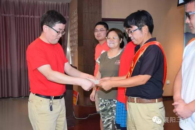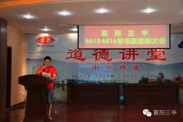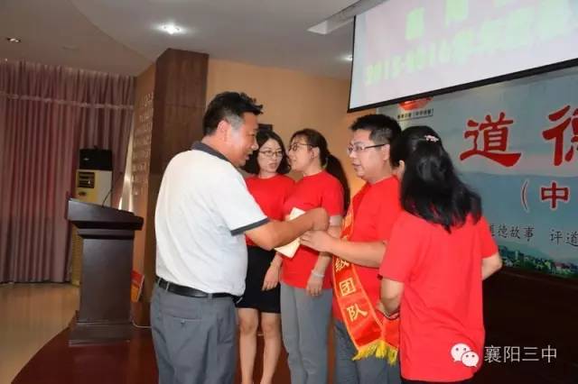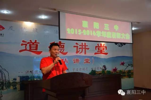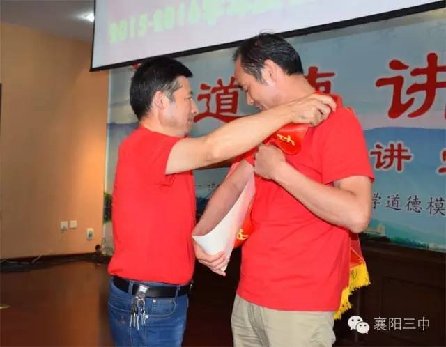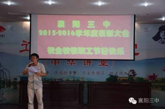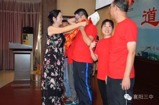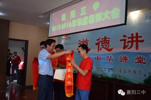 之后,舉行了盛大的頒獎儀式。伴隨著激昂的《頒獎進行曲》,學(xué)校領(lǐng)導(dǎo)給先進團隊和個人佩戴綬帶,頒發(fā)獲獎證書,和他們合影留戀。原高三(13)班班主任鄧永峰老師代表功勛班主任作了典型發(fā)言,介紹了班級管理經(jīng)驗。鄧?yán)蠋熥詈筮€念了一段教師節(jié)當(dāng)天學(xué)生給他寫的節(jié)日祝福,標(biāo)題是《我都不想說你》,歷數(shù)了鄧?yán)蠋熞恍臑榱藢W(xué)生、卻從不注意照顧好自己及家庭的種種事例,這些事例是三中老師敬業(yè)奉獻的真實寫照。原高三化學(xué)教研組組長郭廖麗老師代表優(yōu)秀學(xué)科團隊作了典型發(fā)言,介紹了化學(xué)教研組群策群力,搞好集體備課,提高高三化學(xué)學(xué)科整體成績的經(jīng)驗。新高三級部主任劉常洪和陳顯宏上臺表了決心,這是對明年高考的美好憧憬。
