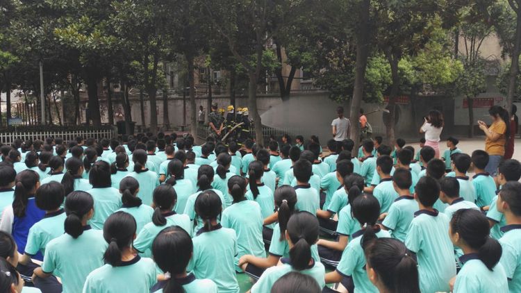 一聲令下,逃生演練開始了。我們迅速?gòu)慕淌摇嬍野踩冯x,緊張有序!