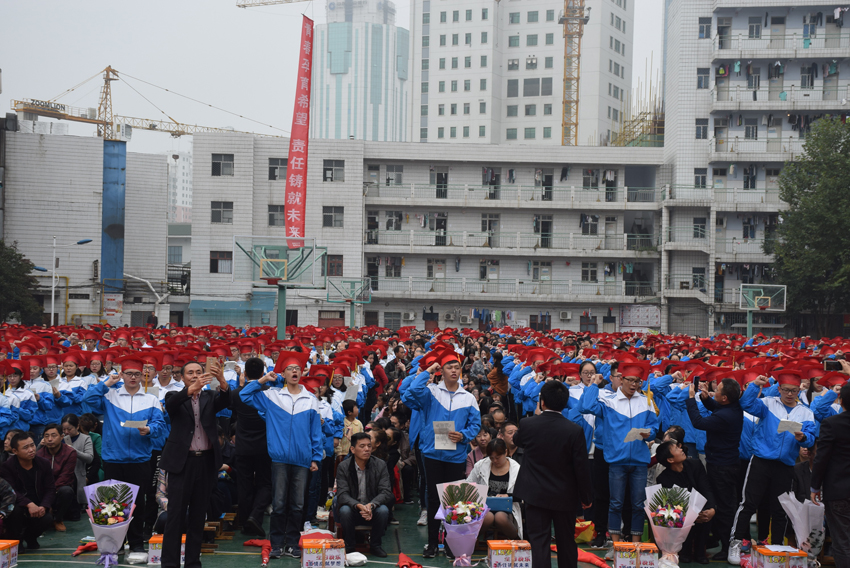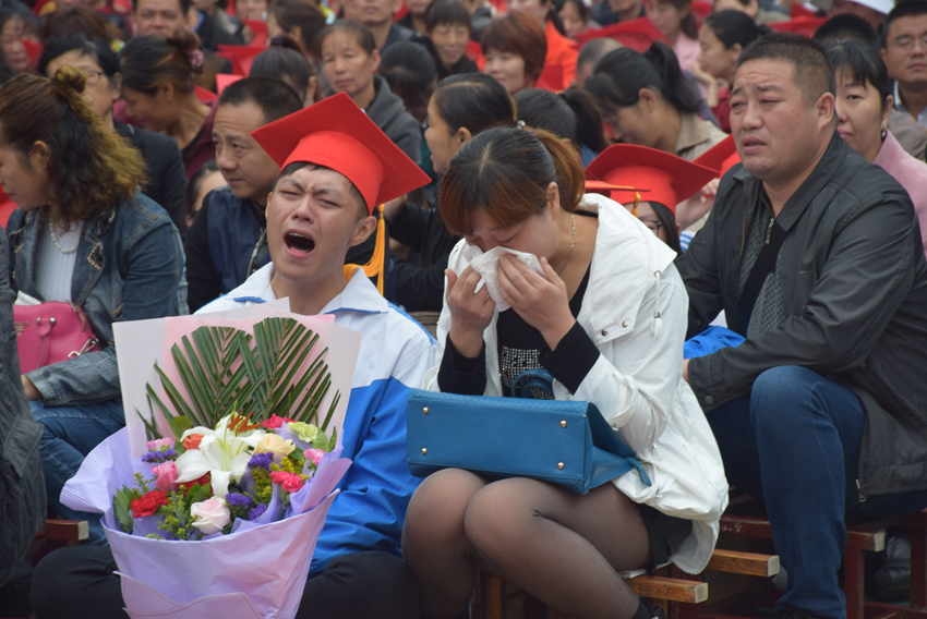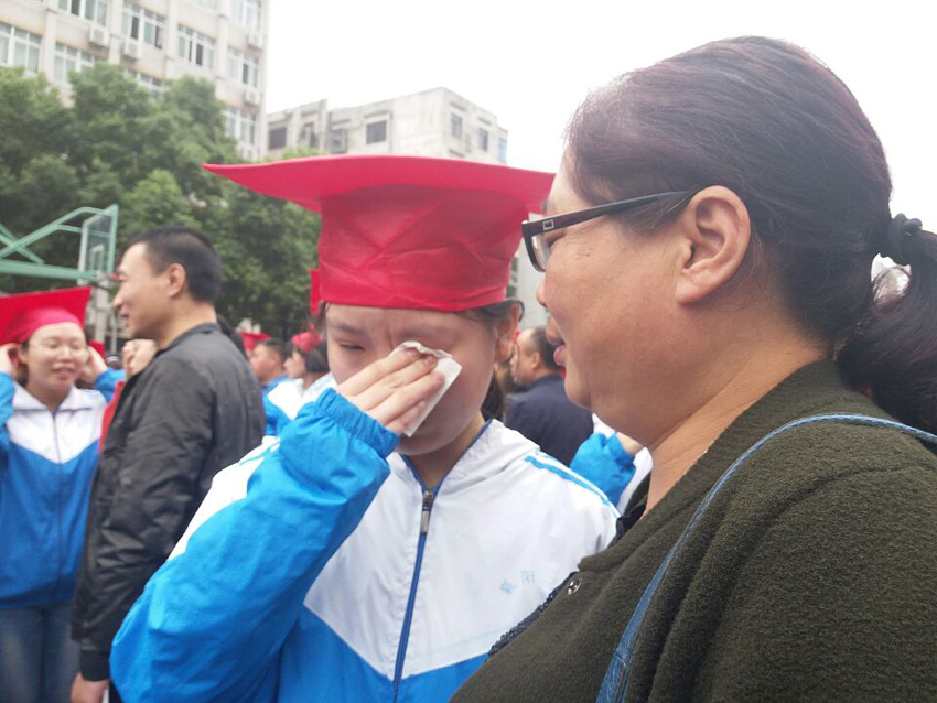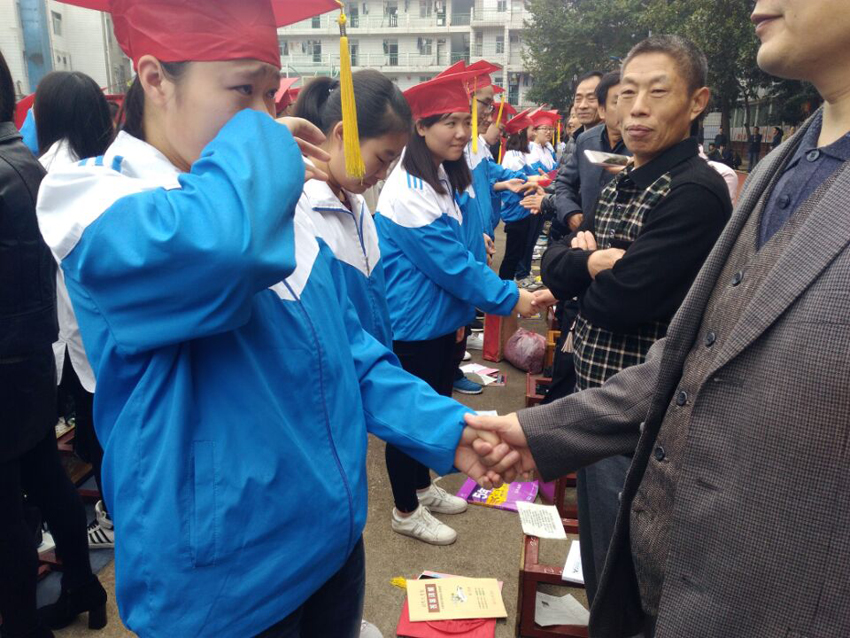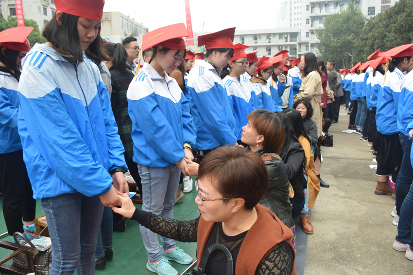 高三(20)班王子琪同學(xué)的現(xiàn)場(chǎng)發(fā)言——《感恩的心》將儀式推向了高潮。她選取了日常生活中父母呵護(hù)孩子的典型事例,有常年如一日給孩子送飯的,有父母生病瞞著孩子的,有高考一直守在考場(chǎng)外的,個(gè)個(gè)感人至深。講著講著,家長(zhǎng)們已是熱淚盈眶,學(xué)生更是淚流滿面。1