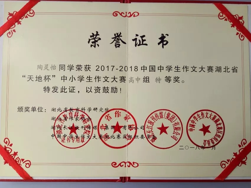 近日,由省教育科學(xué)研究院、省作家協(xié)會(huì)等聯(lián)合主辦的第13屆“天地杯”中學(xué)生作文大賽湖北賽區(qū)結(jié)果揭曉。我校數(shù)十名同學(xué)獲得省級(jí)榮譽(yù),其中,常耀陽(yáng)、陶靈怡斬獲省特等獎(jiǎng),李楠欣、韓澤彬斬獲省一等獎(jiǎng)。
