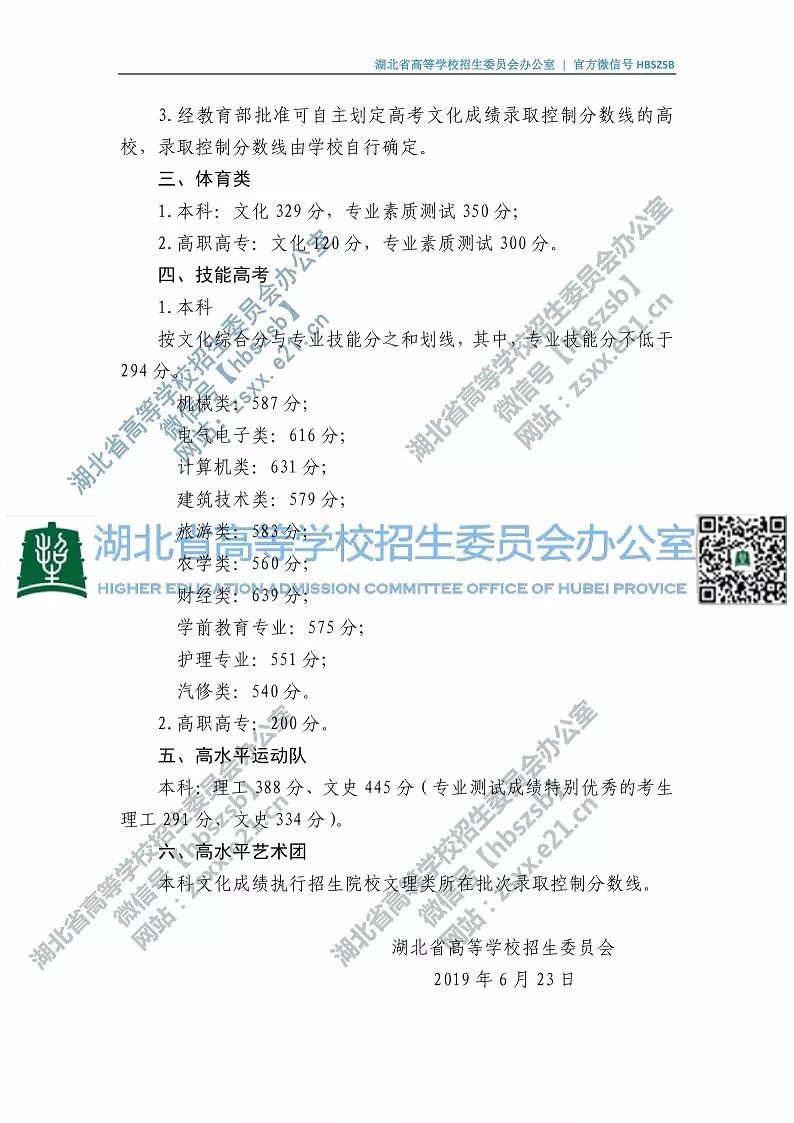 湖北省2019年普通高校招生錄取控制分?jǐn)?shù)線