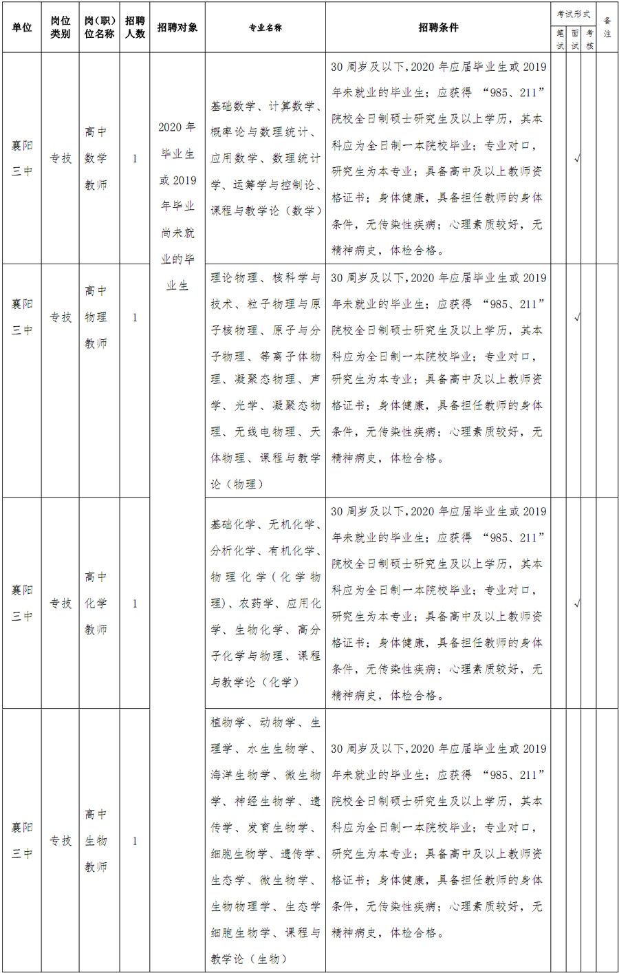 襄陽三中2020年度公開招聘緊缺高層次專業(yè)人才崗位一覽表
