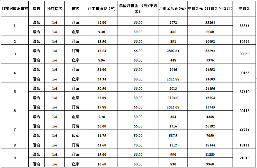 一、出租房面積、底價(jià)(面向門(mén)面房從左至右)